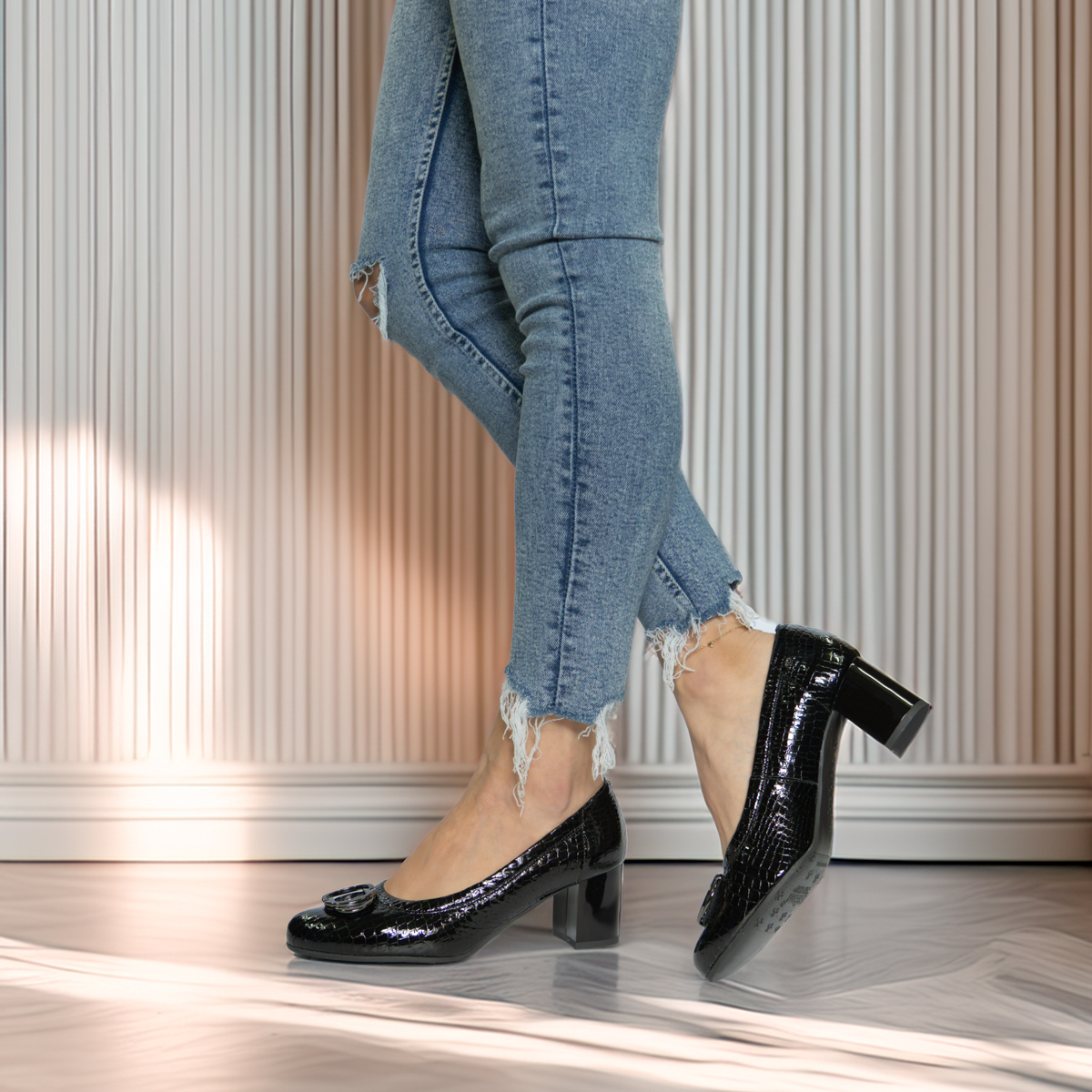 Styl i funkcjonalność: Stabilny 6 cm obcas typu klocek, lakierowana skóra w kolorze czarnym z ozdobnym detalem, pasujący do eleganckich i casualowych stylizacji.