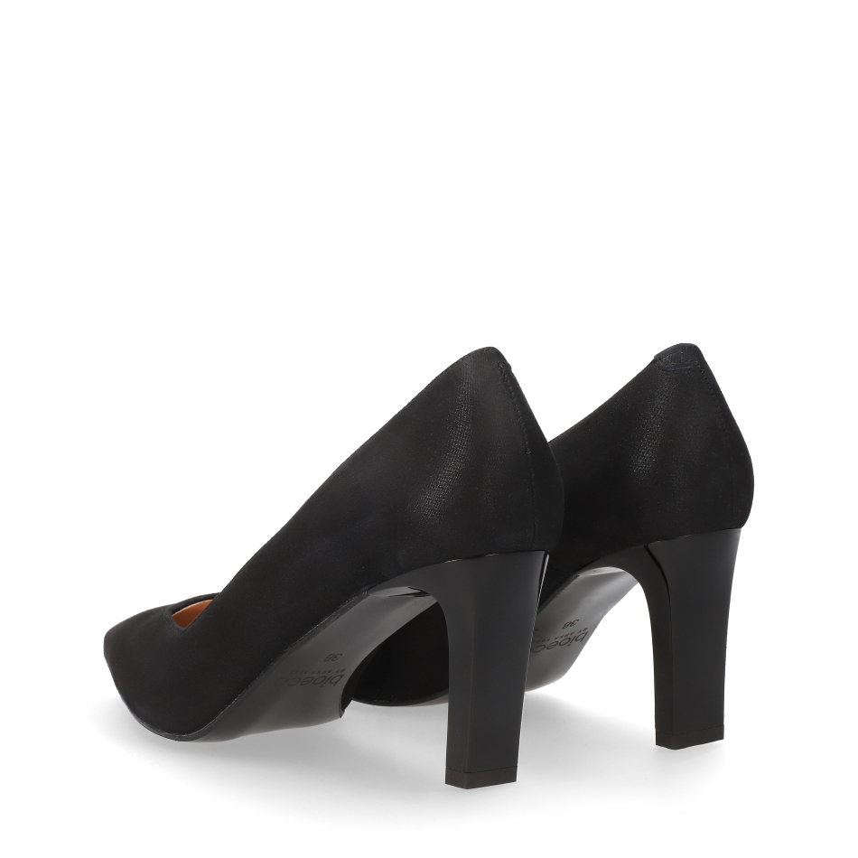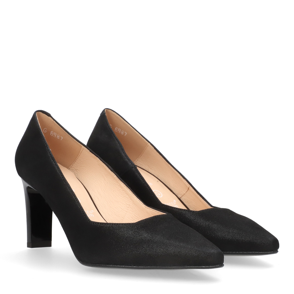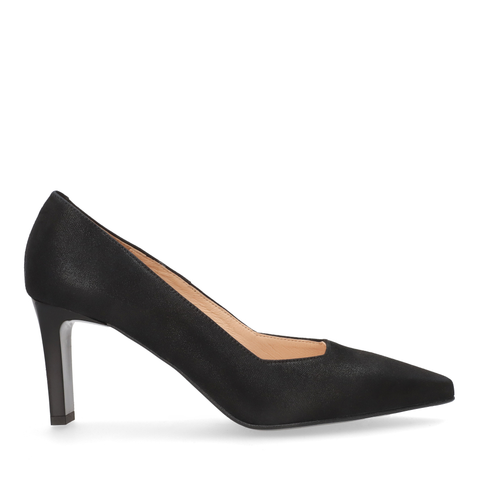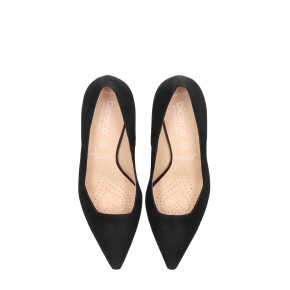 Styl i funkcjonalność: Stabilny 7,5 cm obcas typu słupek, skóra zamszowa w kolorze czarnym oraz klasyczny fason z noskiem w szpic, pasujący do eleganckich i casualowych stylizacji.