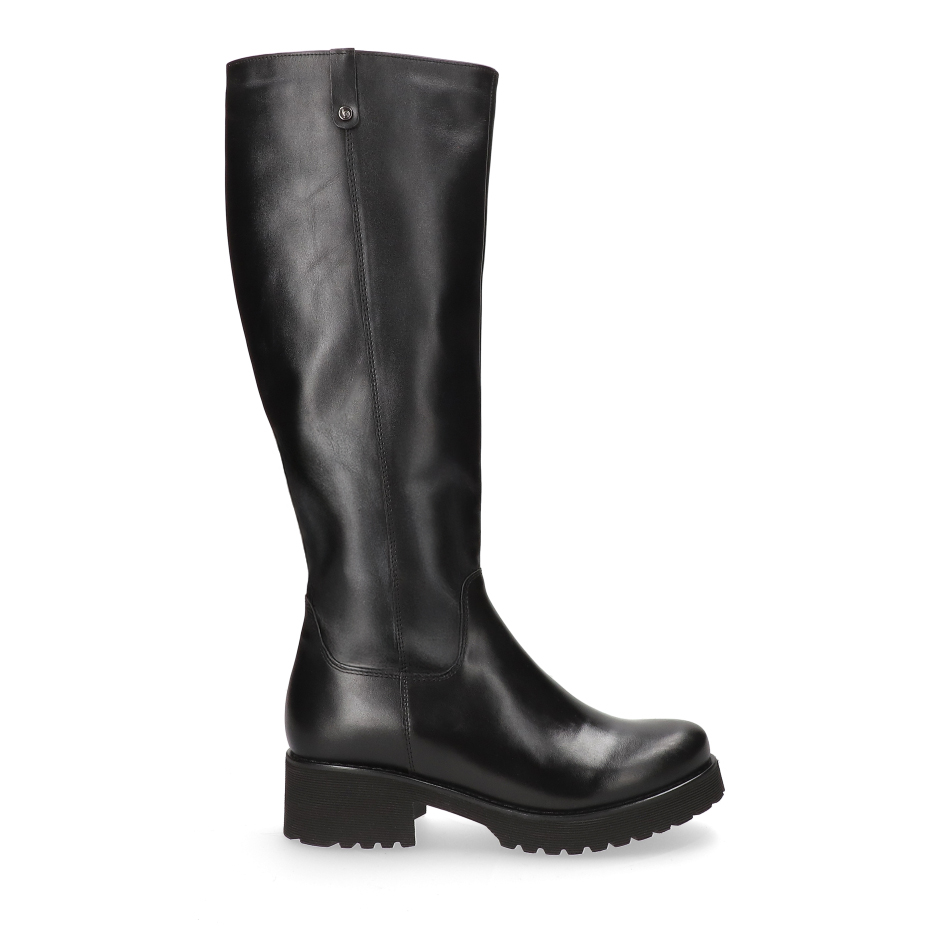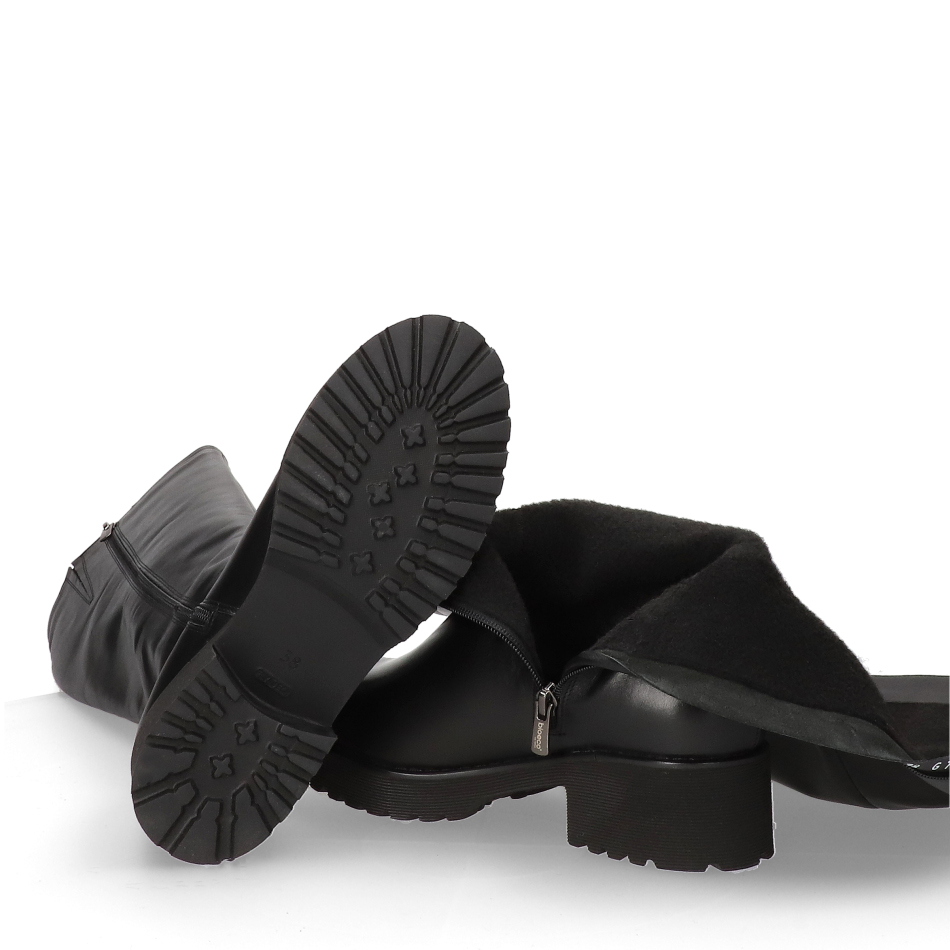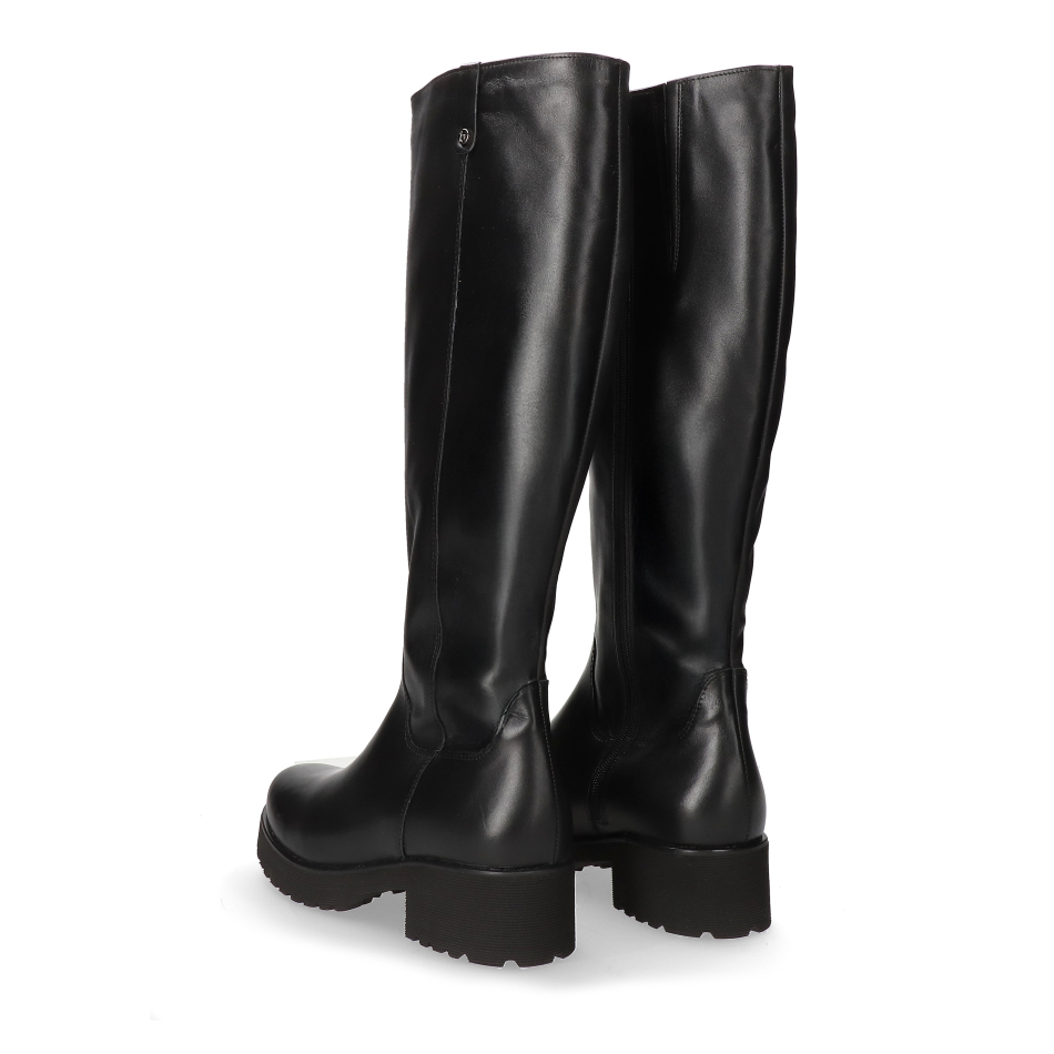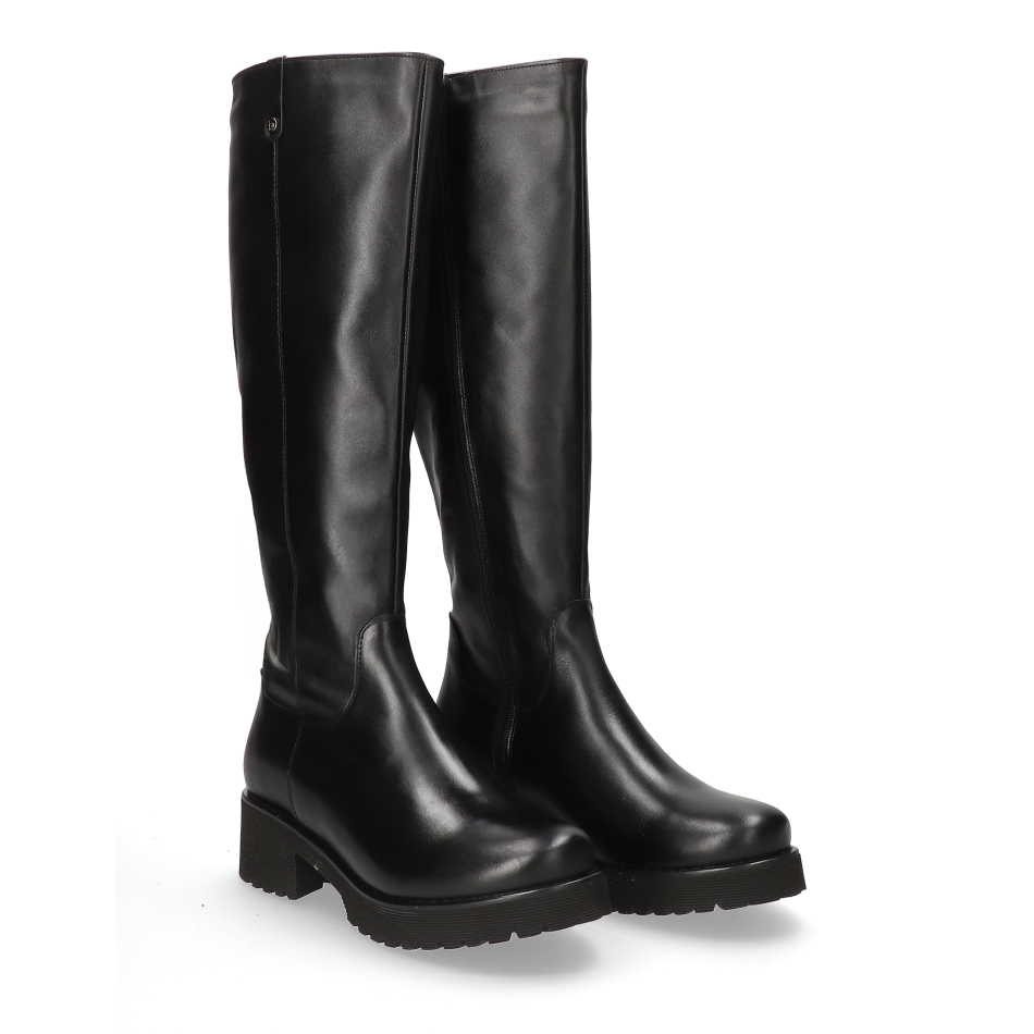 Te długie czarne kozaki to połączenie klasycznej elegancji z wygodą, jaką daje nowoczesna, traperowa podeszwa. Wykonane z gładkiej skóry licowej w uniwersalnym kolorze czarnym, wyróżniają się minimalistycznym fasonem z cholewką sięgającą do kolana. Komfortowa, niska podeszwa doskonale izoluje i zapewnia przyczepność.