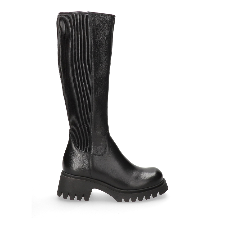 Materiał i Fason: Dolna część cholewki została wykonana z gładkiej skóry licowej. Kozaki charakteryzują się wysoką cholewką, której boczny panel jest uzupełniony elastycznym, prążkowanym materiałem, zapewniającym idealne dopasowanie do łydki.