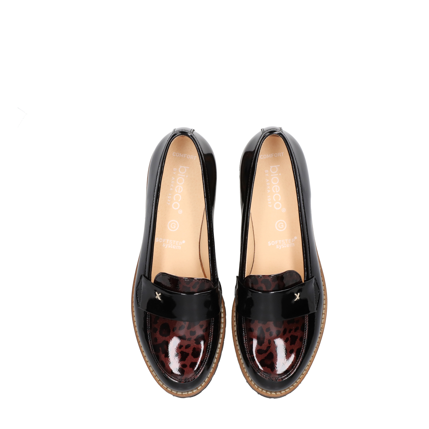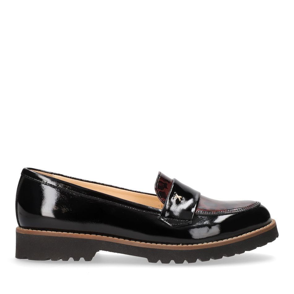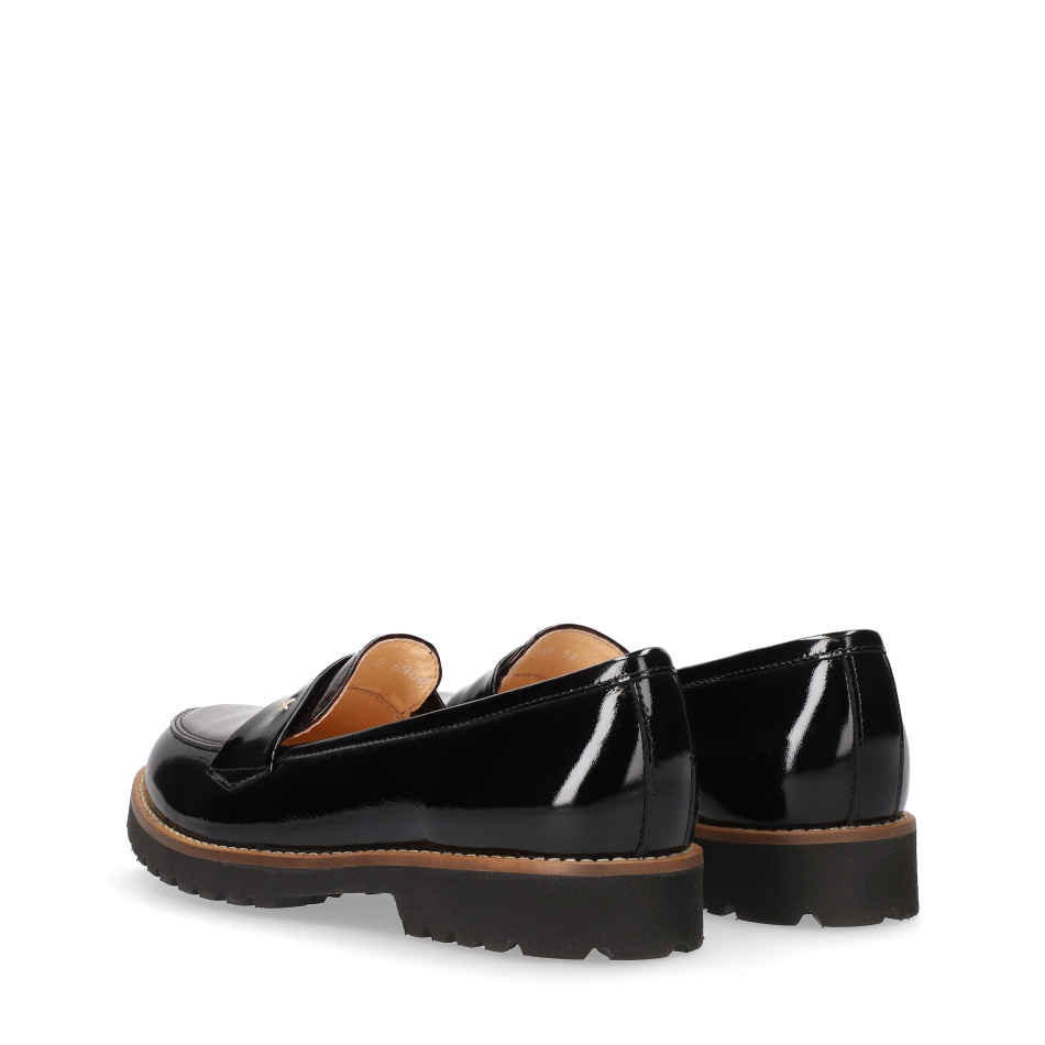 Styl i funkcjonalność: Klasyczny fason mokasynów w czarnym kolorze ze skóry lakierowanej z ozdobnymi detalami, pasujący do wielu eleganckich i casualowych stylizacji.