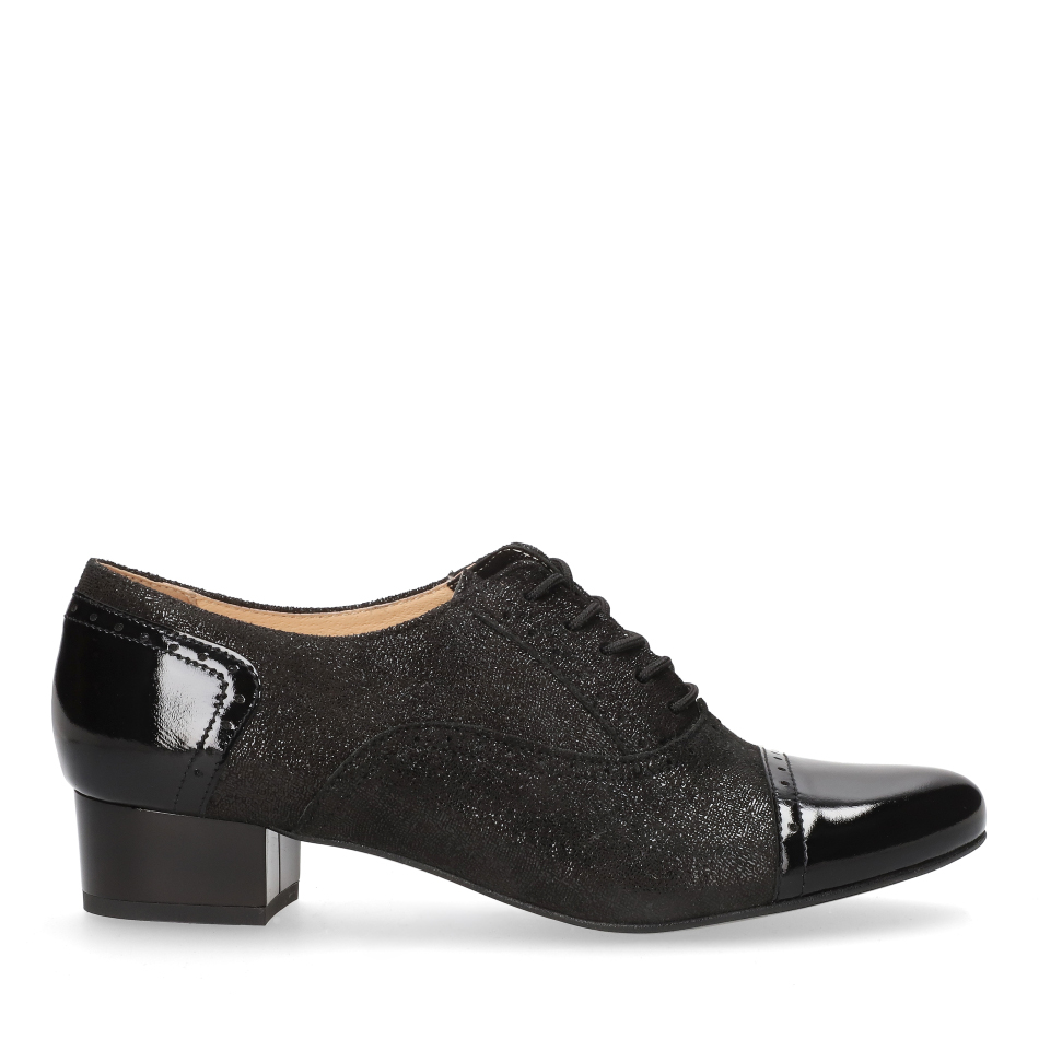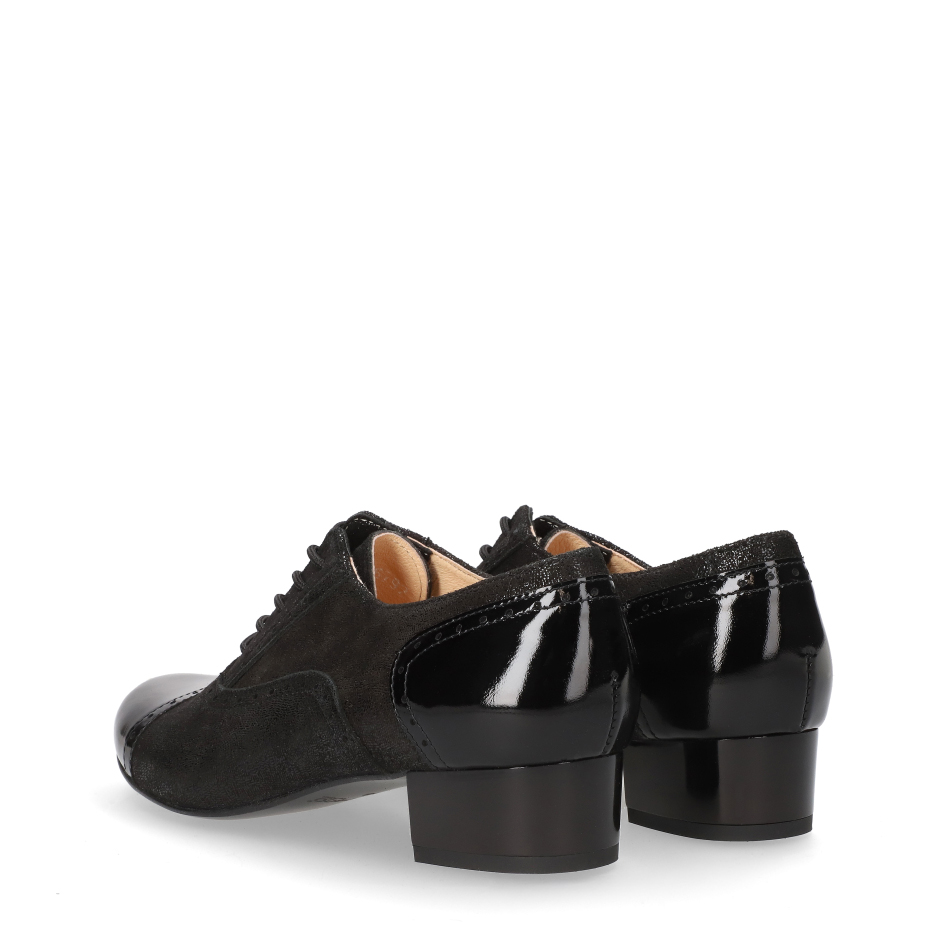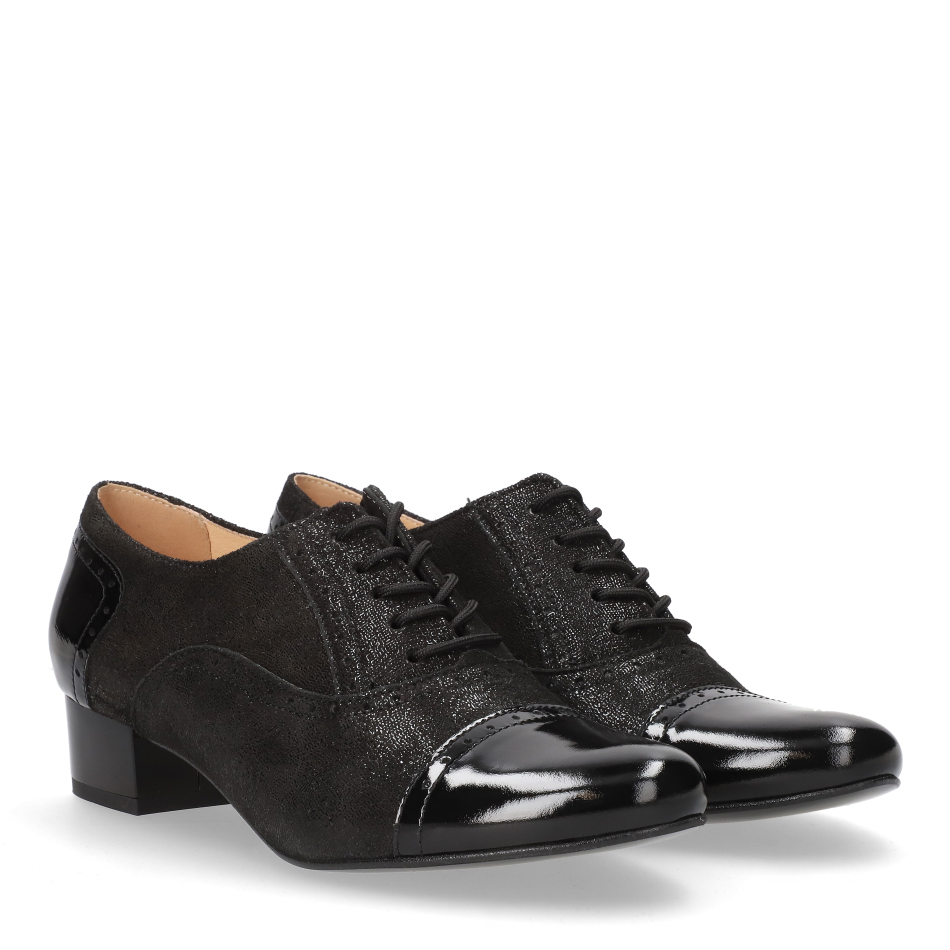Styl i funkcjonalność: Stabilny 3 cm niski obcas typu klocek, skóra w kolorze czarnym i klasyczny fason, pasujący do eleganckich i casualowych stylizacji – lakierowany nosek i zapiętek oraz eleganckie sznurowanie.