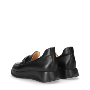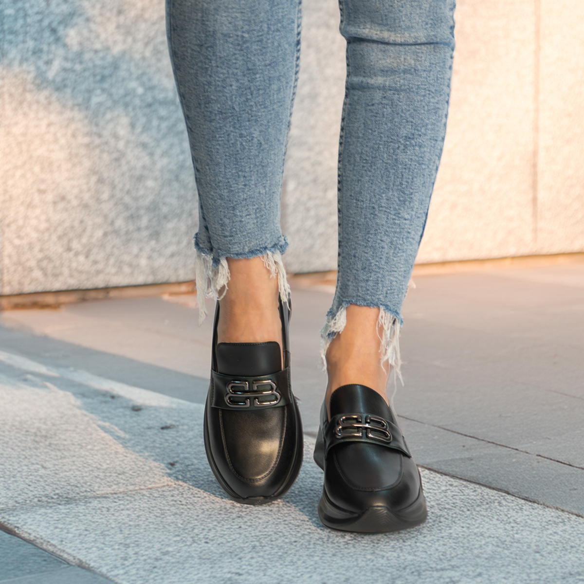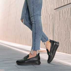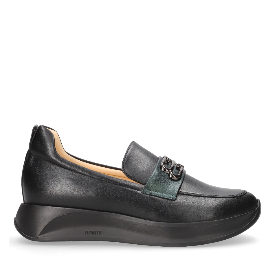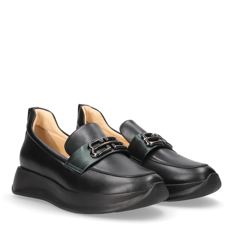 Styl i funkcjonalność: Stabilna płaska podeszwa na platformie z ozdobnym metalowym łańcuchem na podbiciu i kontrastową wstawką, skóra licowa w kolorze czarnym i modny fason, pasujący do eleganckich i casualowych stylizacji.