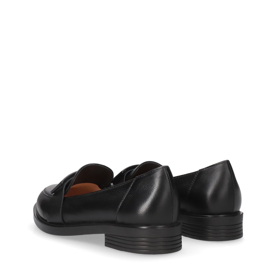 Styl i funkcjonalność: Stabilny 3 cm niski obcas z ozdobnym paskiem i klamrą, skóra licowa w kolorze czarnym i klasyczny fason, pasujący do eleganckich i casualowych stylizacji.