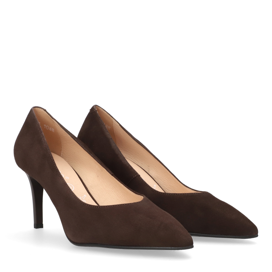 Styl i funkcjonalność: Stabilny 7 cm obcas typu szpilka, skóra zamszowa w kolorze ciemnego brązu oraz klasyczny, wysmuklający fason z noskiem w szpic – idealny do eleganckich i bardziej casualowych stylizacji.