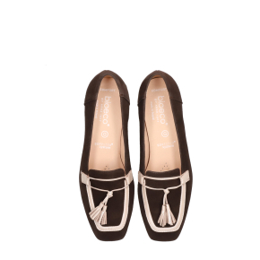 Styl i funkcjonalność: Stabilny 2 cm niski obcas typu klocek z ozdobnymi frędzlami i paskiem na podbiciu, skóra zamszowa z lakierowanymi detalami w kolorze czekoladowym i klasyczny fason, pasujący do eleganckich i casualowych stylizacji.