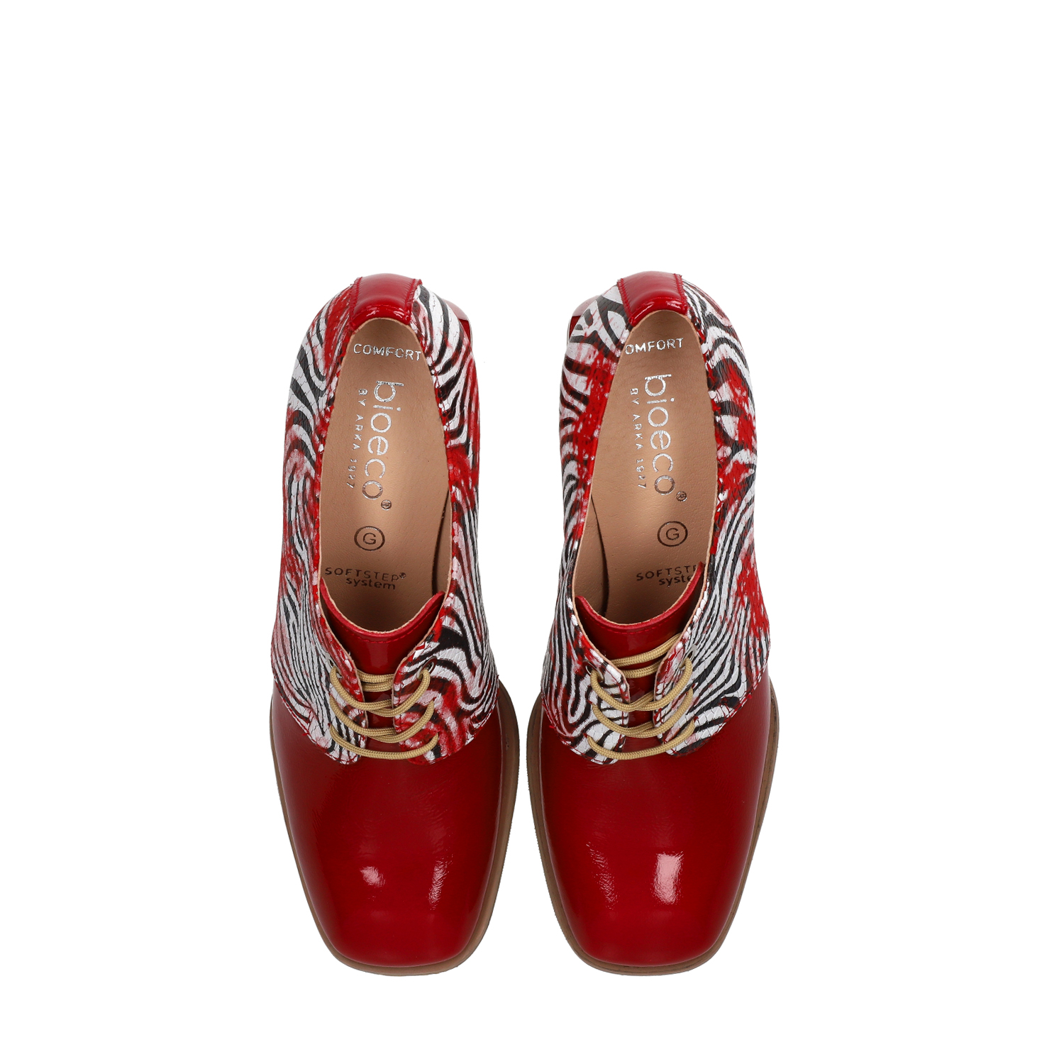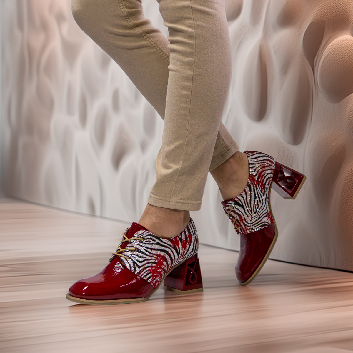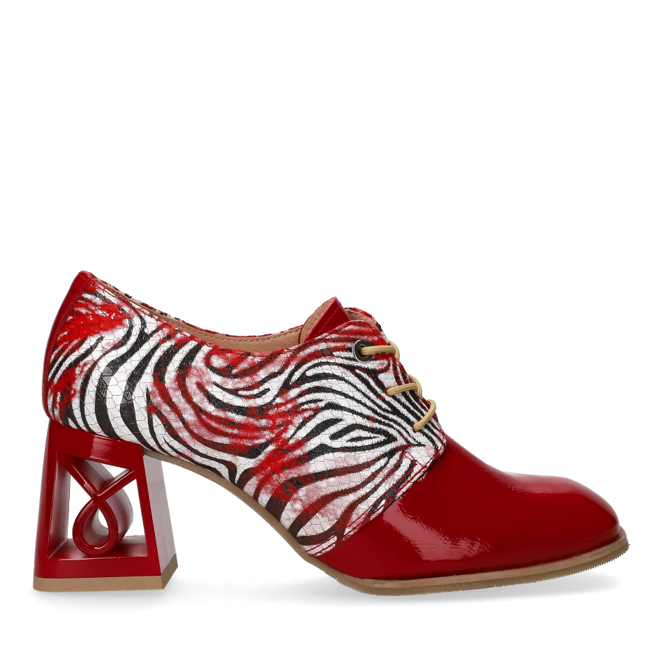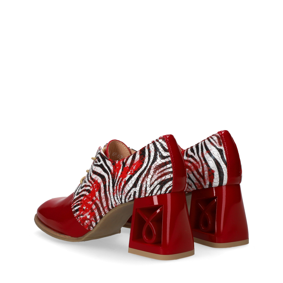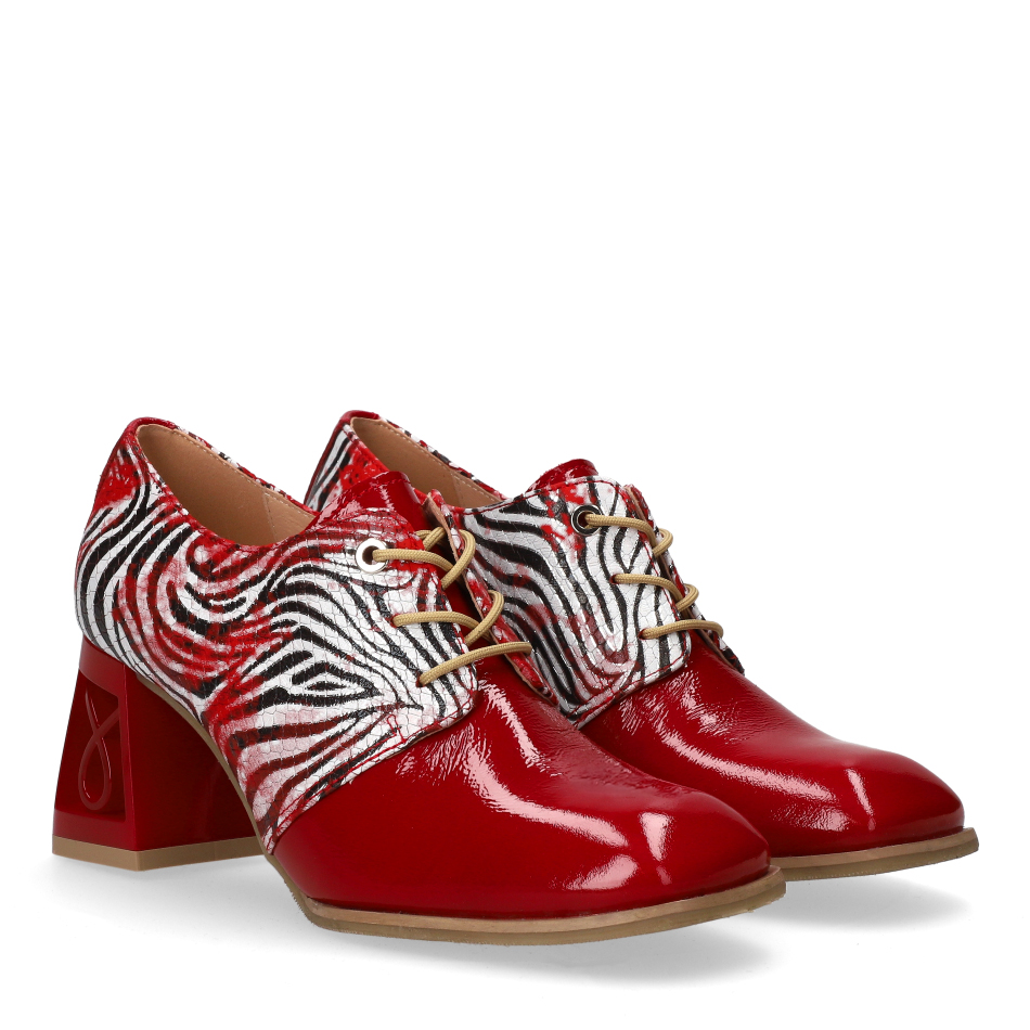 These stylish red lace-up shoes are crafted from a combination of patent leather and natural printed leather. The perforated leather insole and Soft Step system ensure exceptional comfort. A 7 cm block heel adds both elegance and stability.