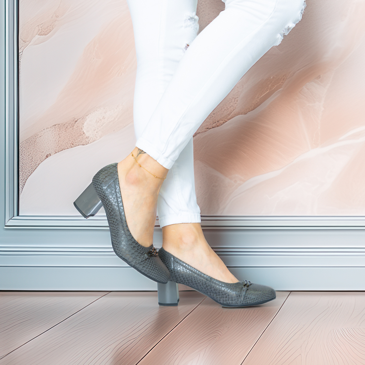 Styl i funkcjonalność: Stabilny 5,5 cm obcas typu klocek, skóra licowa w kolorze grafitowym z ozdobnym detalem, pasujący do eleganckich i casualowych stylizacji.