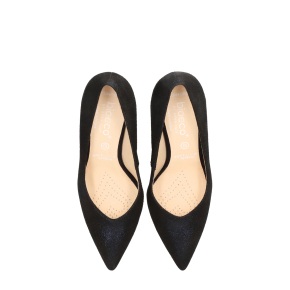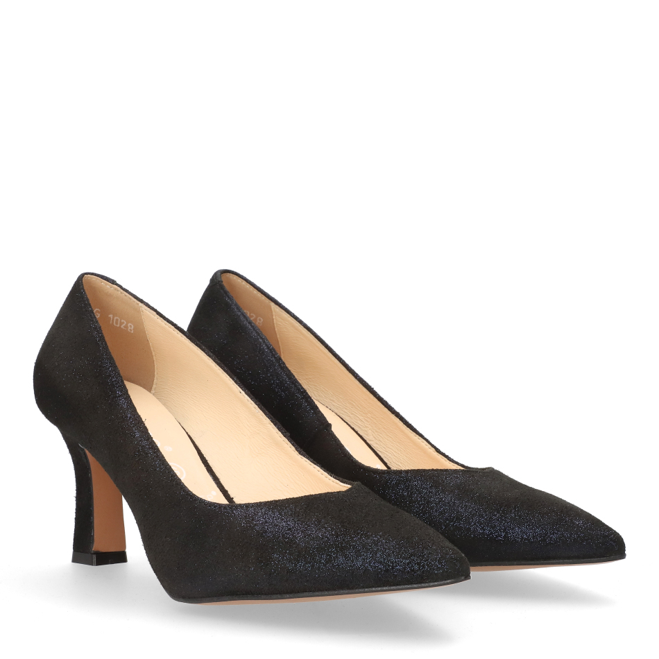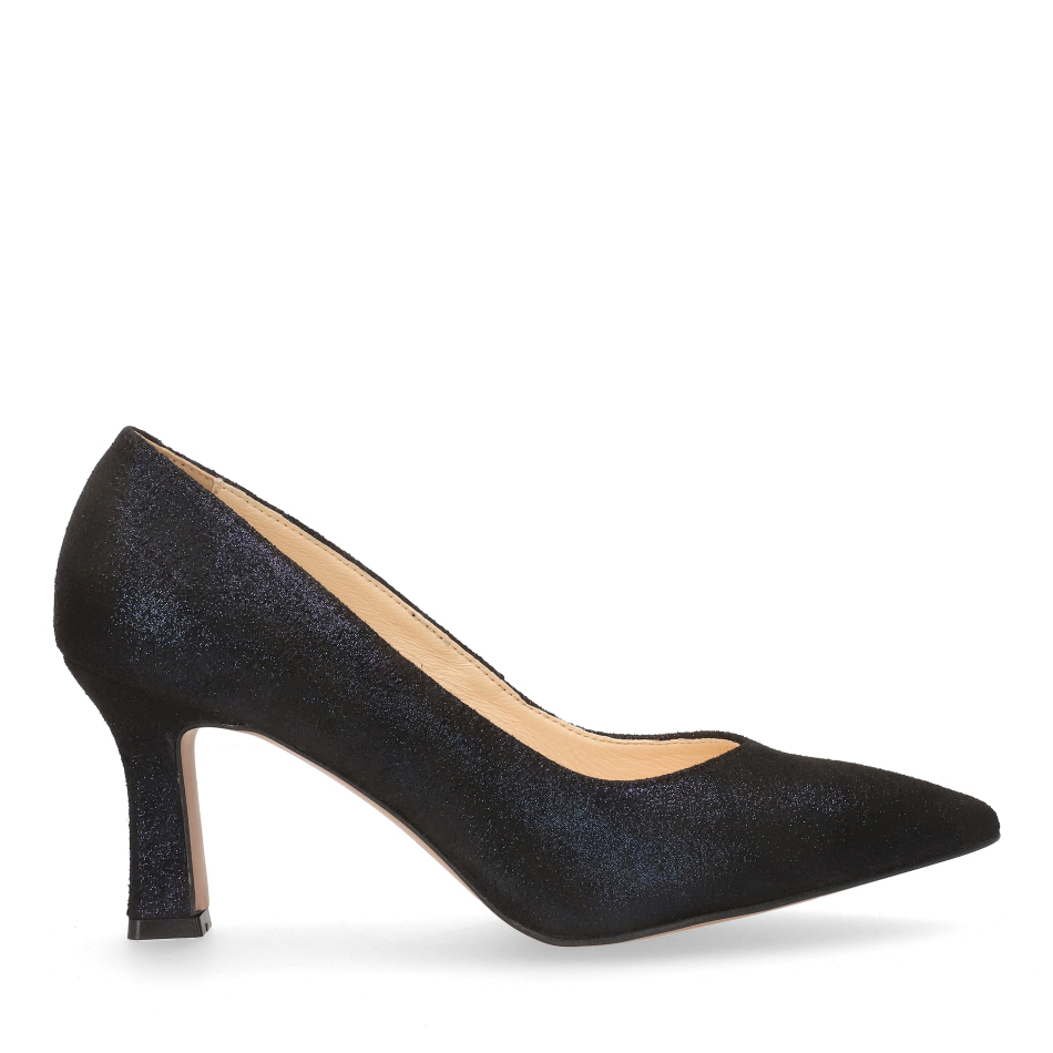 Styl i funkcjonalność: Stabilny 7 cm obcas typu szpilka ze smukłym, szpiczastym noskiem, skóra zamszowa brokatowa w kolorze granatowym i klasyczny fason, pasujący do eleganckich i casualowych stylizacji.