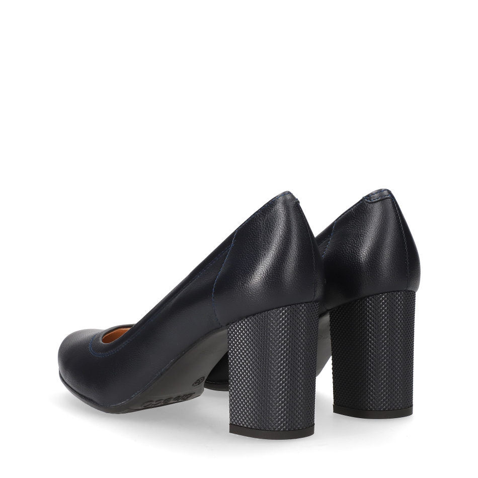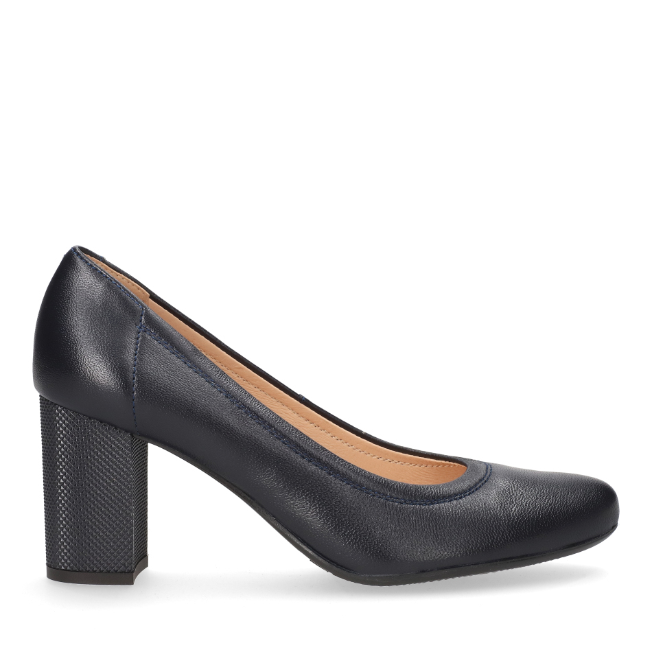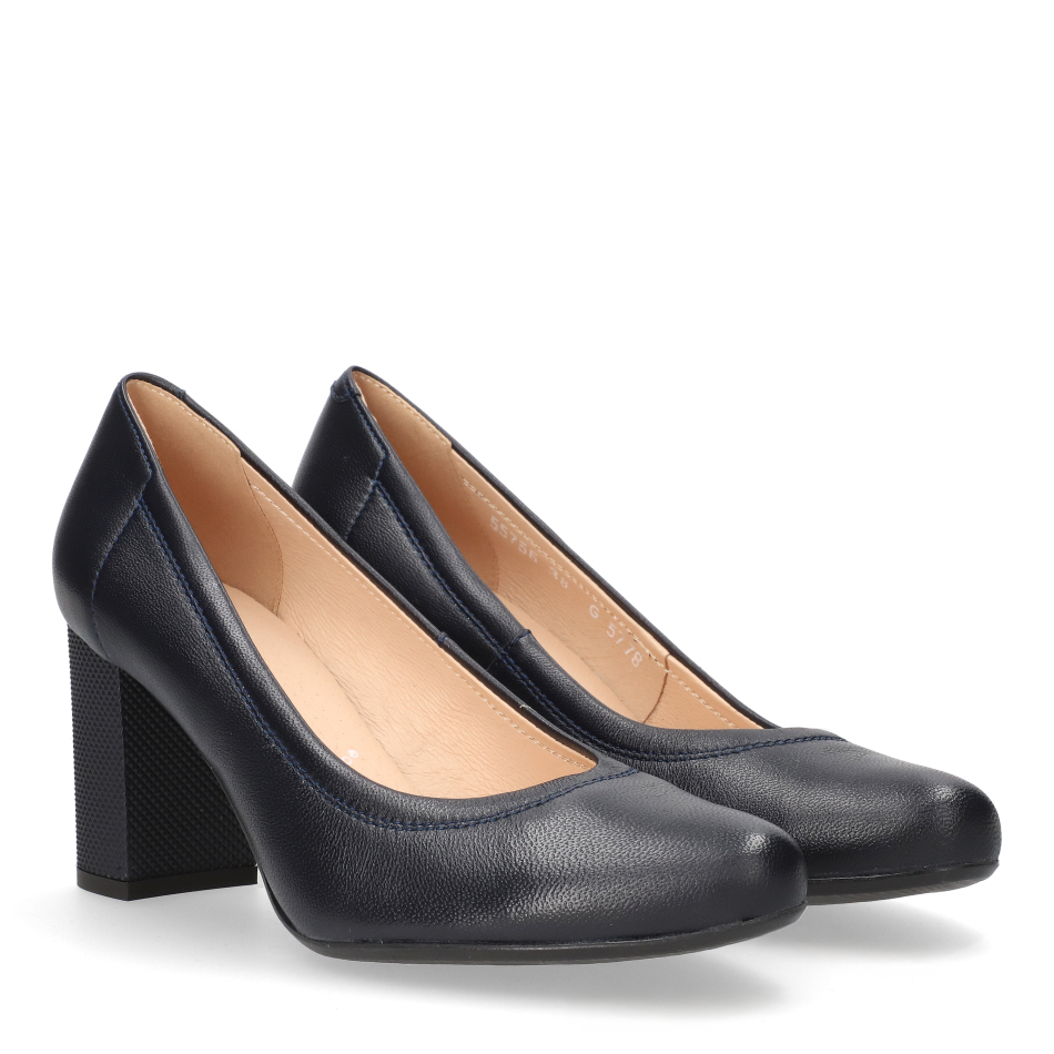 Styl i funkcjonalność: Stabilny 7,5 cm obcas na słupku z fakturowanym wykończeniem obcasa, skóra licowa w kolorze granatowym i klasyczny fason, pasujący do eleganckich i casualowych stylizacji.
