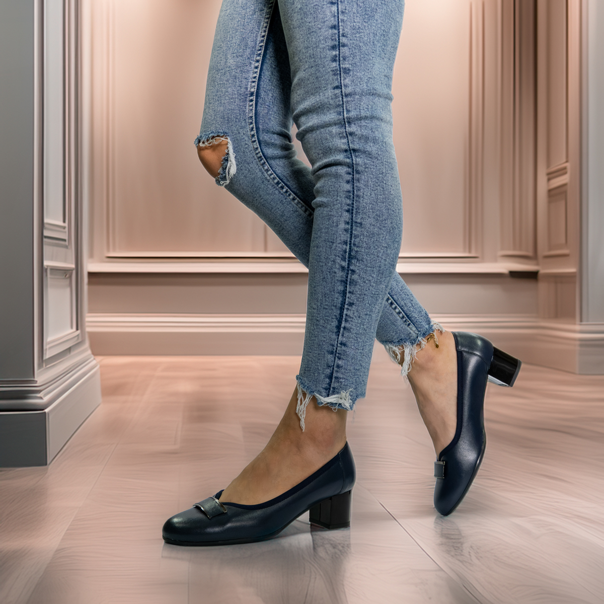 Prezentujemy model, który idealnie łączy klasyczną formę z innowacyjnymi rozwiązaniami zapewniającymi wyjątkowy komfort. To skórzane czółenka na stabilnym obcasie, wyprodukowane w Polsce z dbałością o najwyższą jakość materiałów i detali. Choć na zdjęciu widoczny jest kolor granatowy, poniższy opis dotyczy wersji w eleganckiej czerni, zgodnej z Twoimi preferencjami.