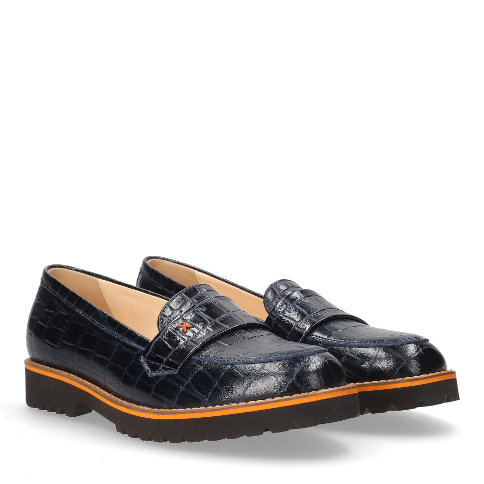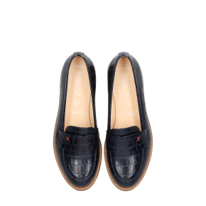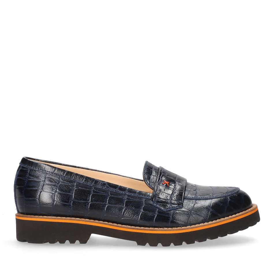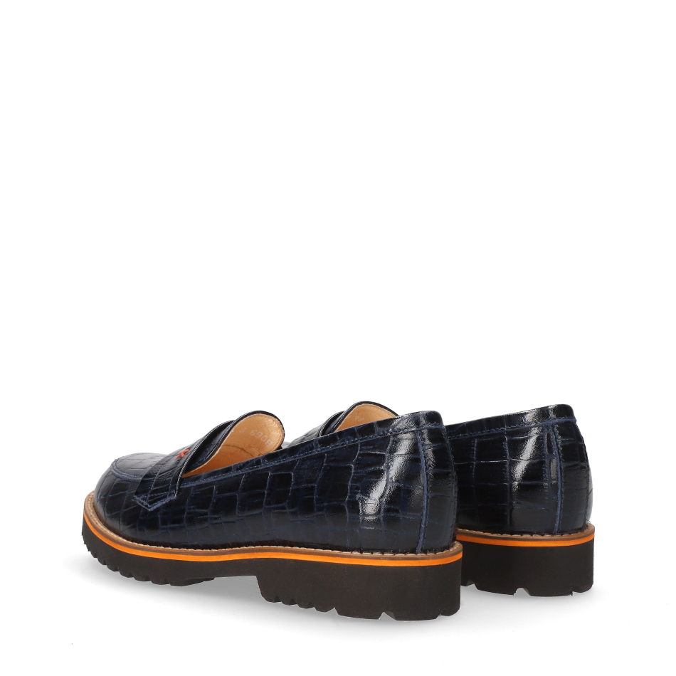 Styl i funkcjonalność: Stabilna płaska podeszwa , skóra licowa tłoczona krokodyl w kolorze granatowym i ponadczasowy fason, pasujący do eleganckich i casualowych stylizacji, z kontrastowym pomarańczowym paskiem na podeszwie.