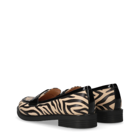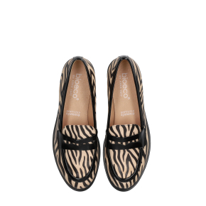 Mokasyny wykonane z wysokiej jakości licowej skóry, z ciekawym czarno-beżowym wzorem, stanowią modny akcent w codziennych stylizacjach. Polska produkcja gwarantuje dbałość o detale i trwałość materiałów.