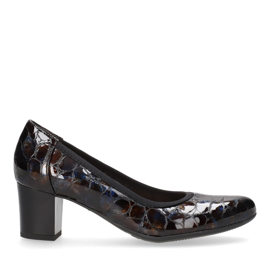 Czółenka wykonane z wysokiej jakości wzorzystej, kolorowej skóry licowej wyróżniają się niebanalną stylistyką i precyzyjnym wykończeniem. Stabilny obcas typu klocek o wysokości 5,5 cm oraz elastyczna zewnętrzna gumka wokół cholewki gwarantują doskonałe dopasowanie do stopy i wygodę przez cały dzień.
