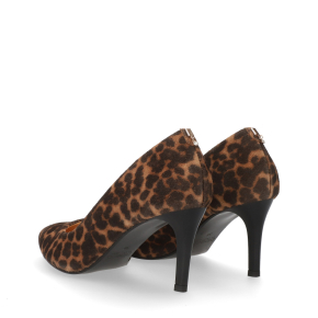 Styl i funkcjonalność: Stabilny 7 cm szpilka, skóra zamszowa w kolorze brązowo-czarnym w panterkę i klasyczny fason, pasujący do eleganckich i casualowych stylizacji.