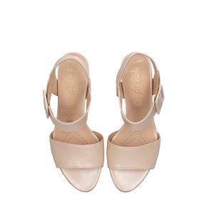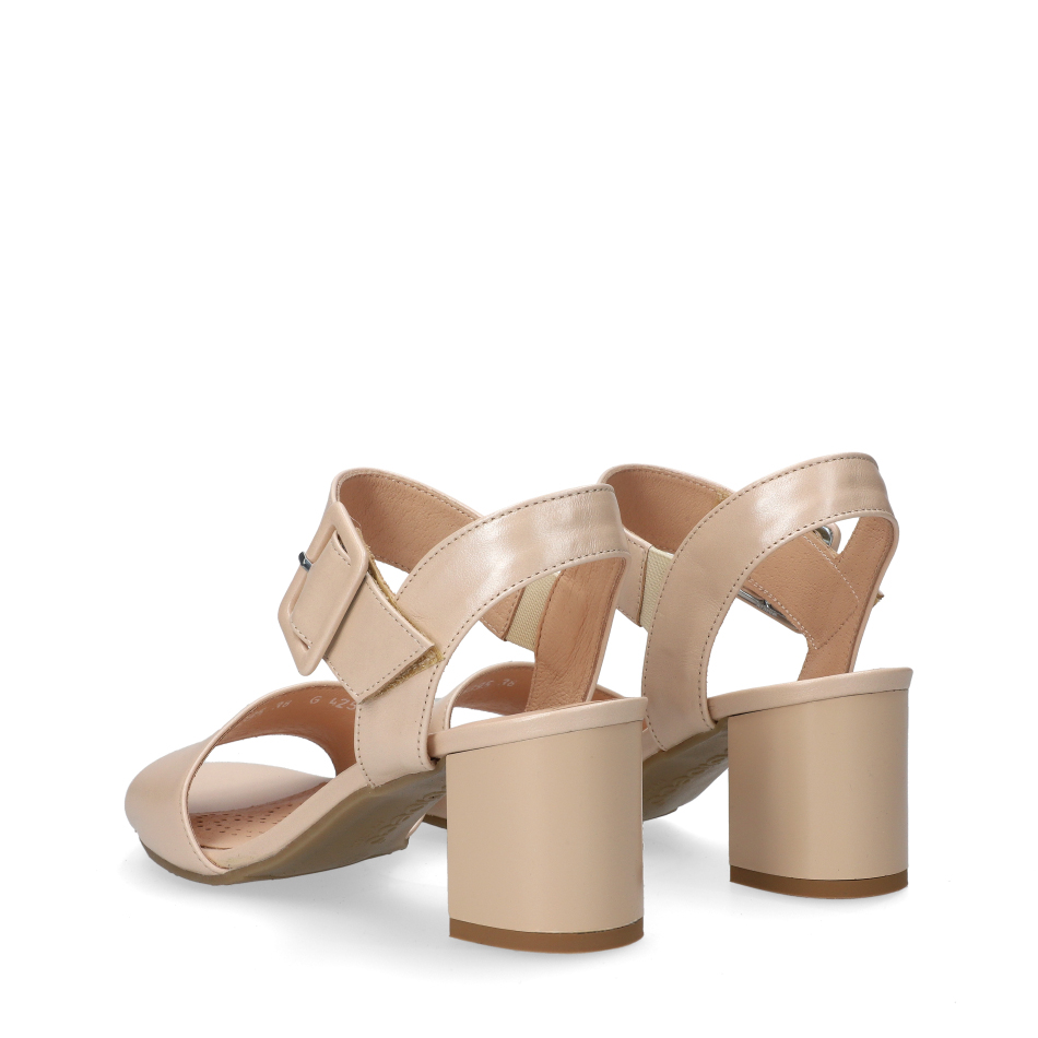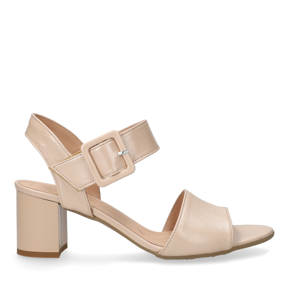 Styl i funkcjonalność: Stabilny 6.5 cm obcas typu klocek z szerokim paskiem przy kostce, ozdobną klamrą oraz zapięciem na rzep, skóra licowa w kolorze perłowym i klasyczny fason, pasujący do eleganckich i casualowych stylizacji.