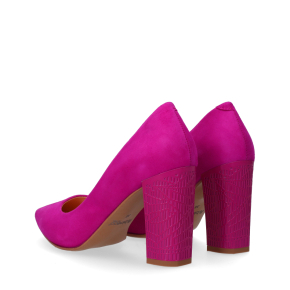 Styl i funkcjonalność: Stabilny 9 cm obcas typu słupek, wykonany z zamszu w kolorze fuksji, pasujący do eleganckich stylizacji.