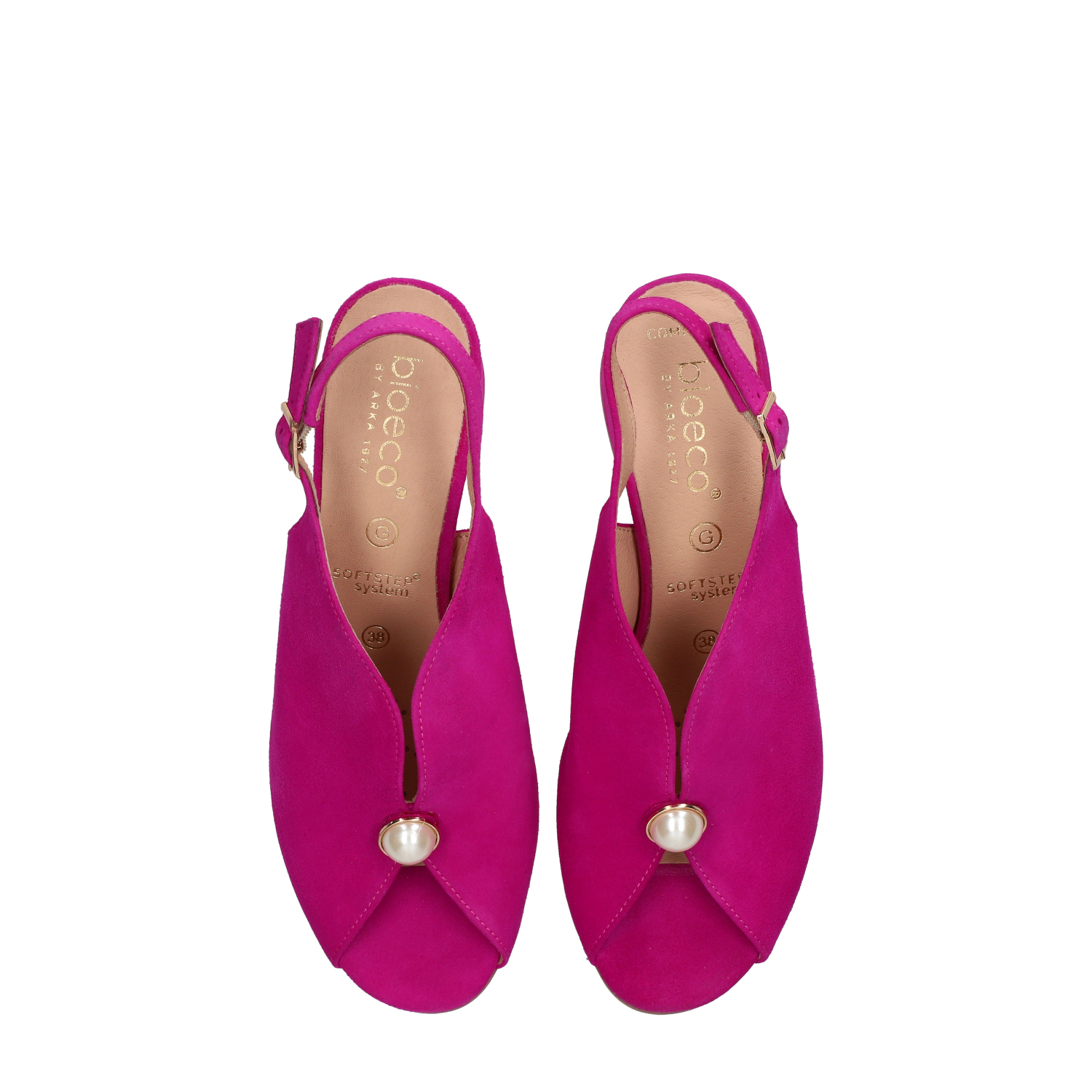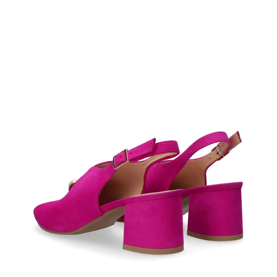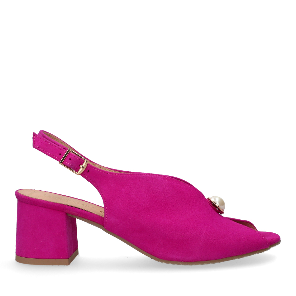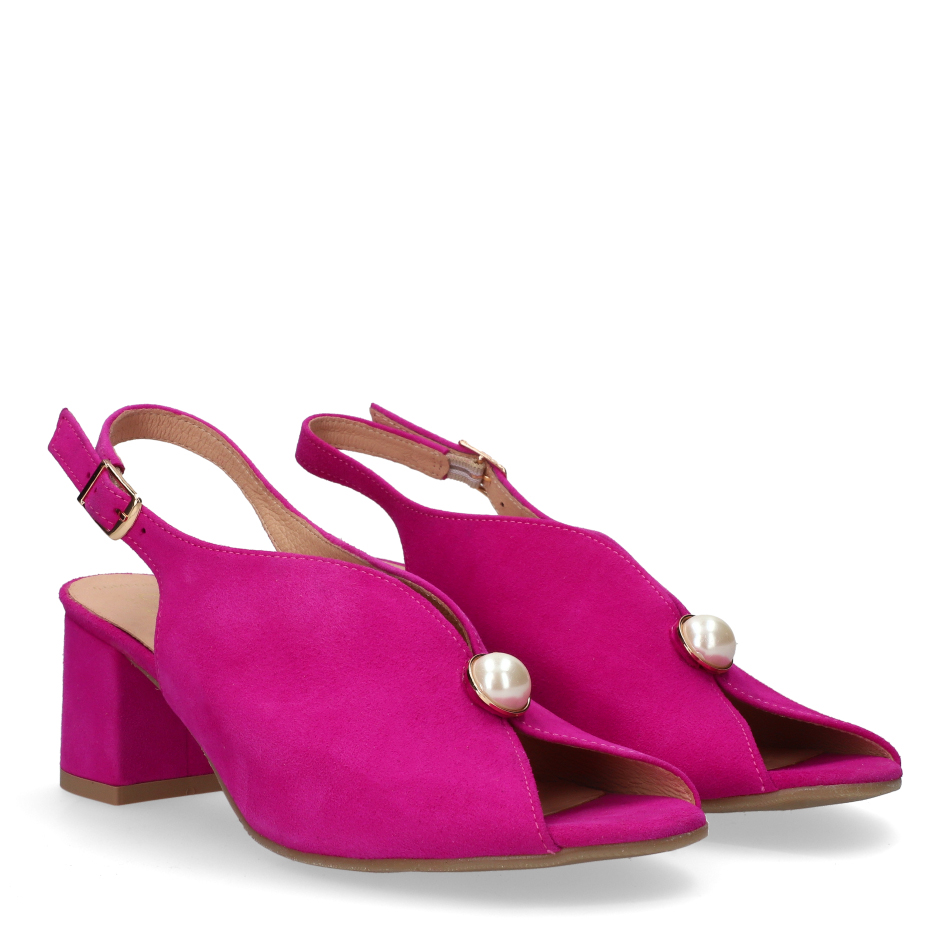 Styl i funkcjonalność: Stabilny 5.5 cm obcas typu klocek z ozdobną perłą i paskiem wokół pięty, skóra zamszowa w kolorze różowym i klasyczny fason, pasujący do eleganckich i casualowych stylizacji.