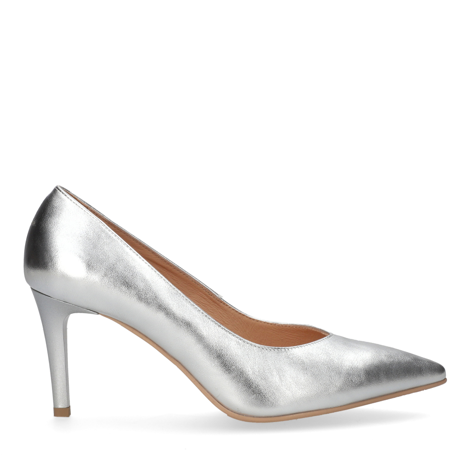 Styl i funkcjonalność: Stabilny 7 cm obcas typu szpilka ze smukłym, szpiczastym noskiem, skóra licowa metalizowana w kolorze srebrnym i klasyczny fason, pasujący do eleganckich i casualowych stylizacji.