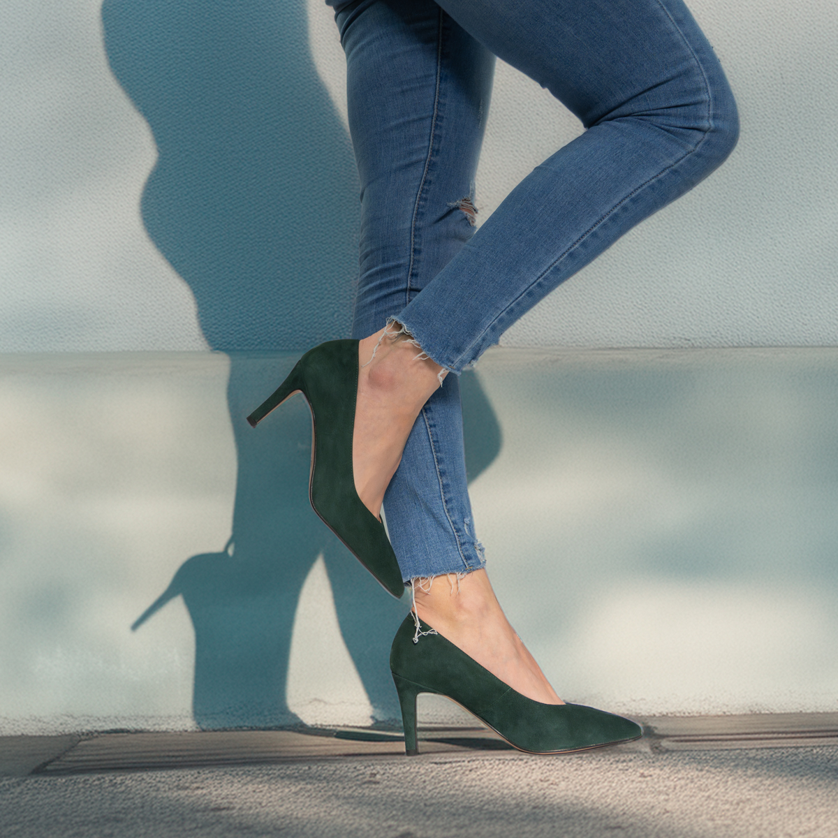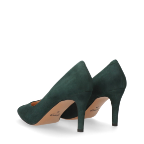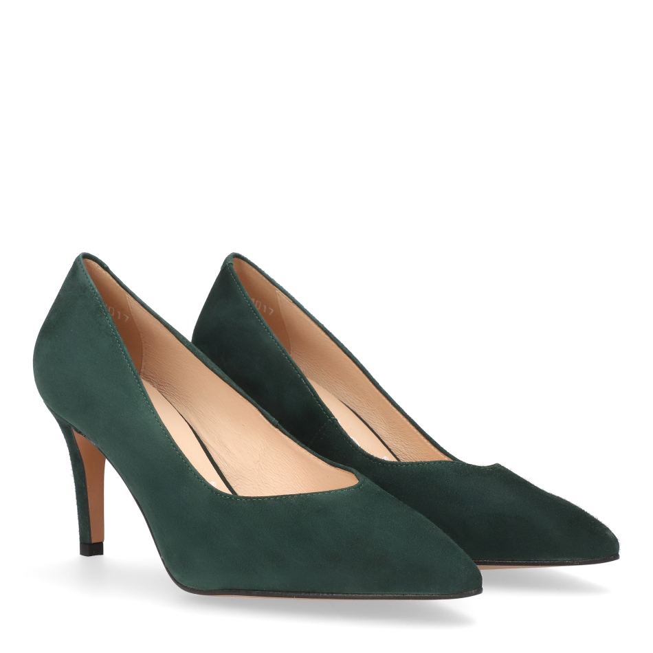 Styl i funkcjonalność: Stabilny 7 cm obcas typu szpilka, skóra zamszowa w kolorze ciemnozielonym i klasyczny, smukły fason z noskiem w szpic – idealny do eleganckich i casualowych stylizacji.