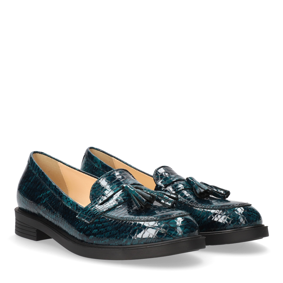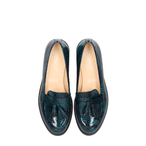 Mokasyny wykonane z naturalnej skóry lakierowanej w kolorze zielonym.Wewnątrz buta skórzana, perforowana wkładka dzięki której twoje stopy swobodnie oddychają.Elastyczna i niezwykle wytrzymała podeszwa zapewni naturalny komfort chodzenia.Przód buta ozdobiony frędzlami.Model dla kobiet ceniących komfort i wygodę,doskonała propozycja do codziennego chodzenia.