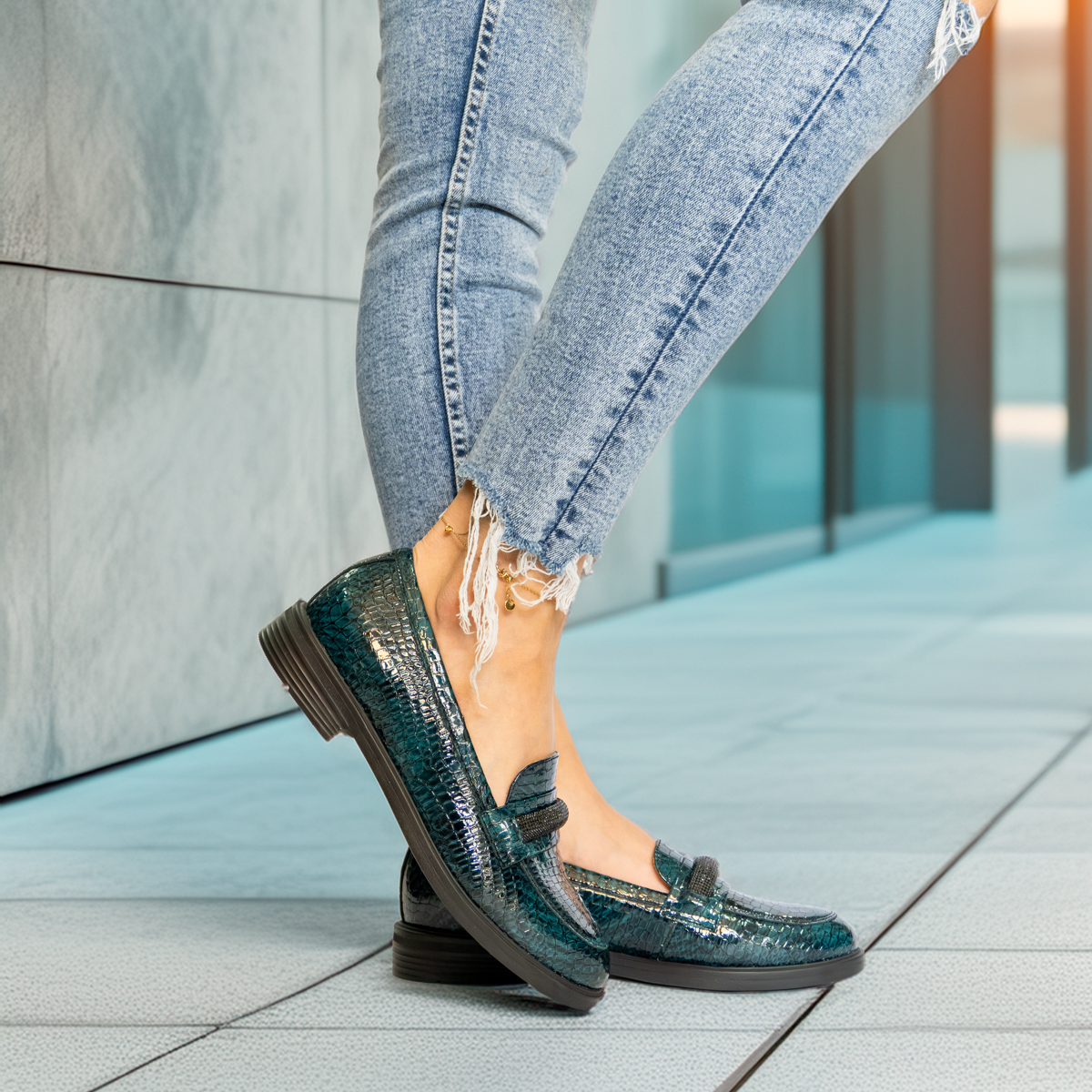 Styl i funkcjonalność: Obuwie w kolorze zielonym z lakierowaną skórą z ozdobnym paskiem wysadzanym dżetami, pasujące do eleganckich i casualowych stylizacji.