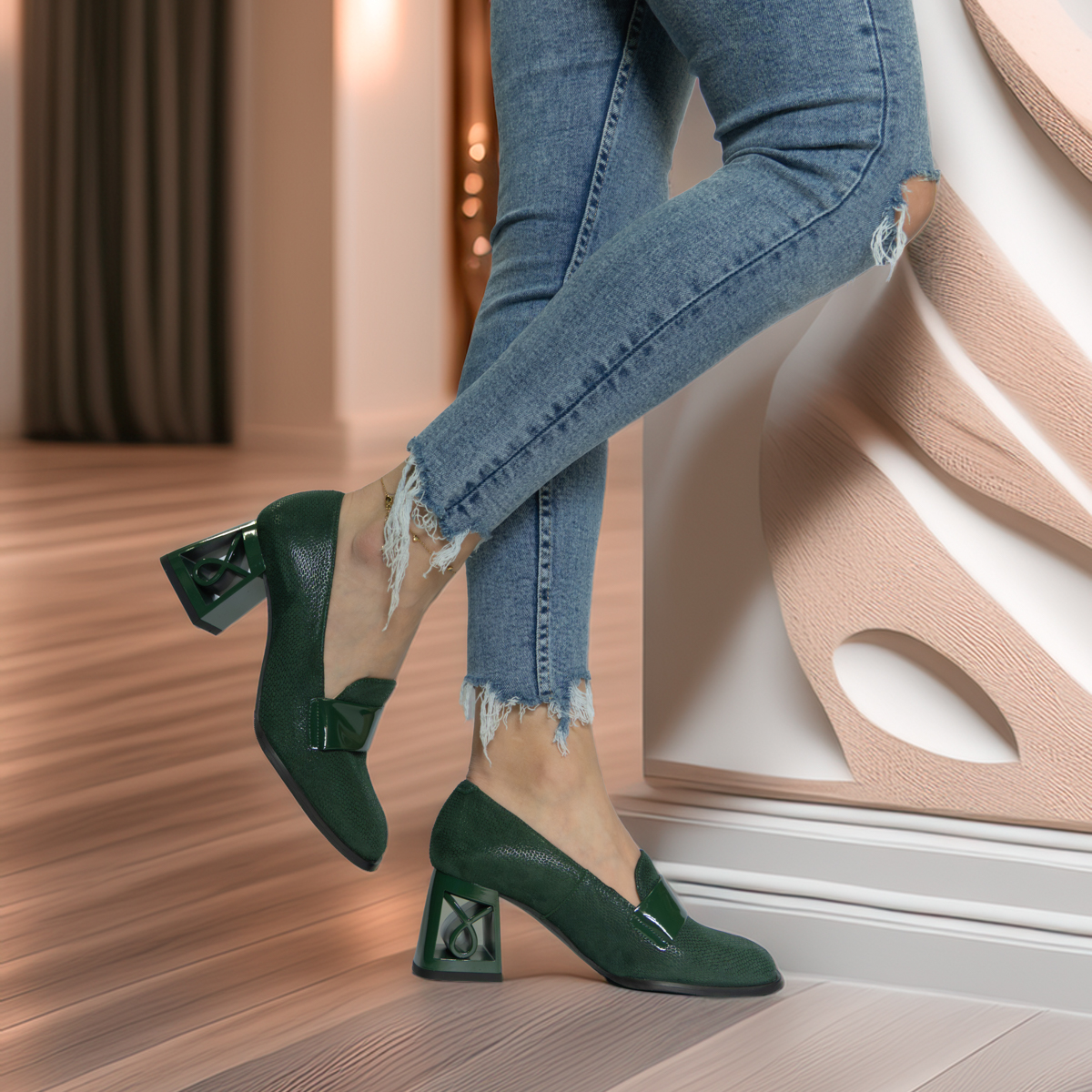 Styl i funkcjonalność: Stabilny 7 cm obcas typu klocek, skóra licowa w kolorze zielonym z ozdobnym detalem, pasujący do eleganckich i casualowych stylizacji.