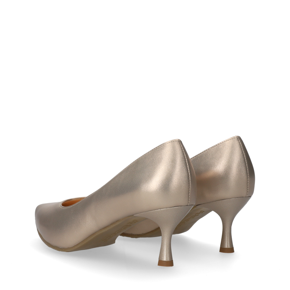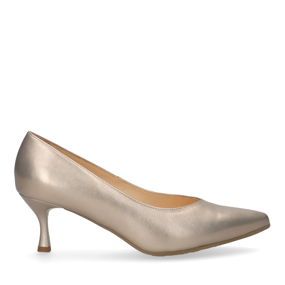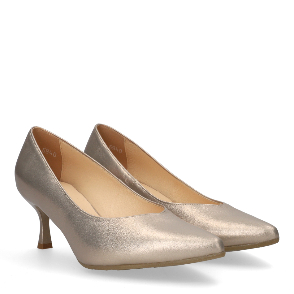 Styl i funkcjonalność: Stabilny 6 cm obcas typu szpilka ze smukłym, lekko wydłużonym noskiem, skóra licowa metalizowana w kolorze złotym i klasyczny fason, pasujący do eleganckich i casualowych stylizacji.